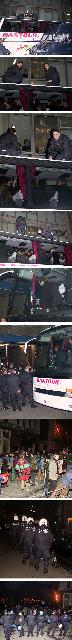 Een veertigtal andersglobalisten - hoofdzakelijk uit Nederland - bezetten woensdagmorgen [12-12-2001] de gebouwen van het chemiebedrijf CEFI. Ze werden prompt als "gijzelnemers" gevangen gezet. Met dwang en in de handboeien werden ze België uitgezet. Foto´s van de Belgische flikken die hen in Brussel met geweld de bus indrijven.  Een veertigtal andersglobalisten - hoofdzakelijk uit Nederland - bezetten woensdagmorgen [12-12-2001] de gebouwen van CEFI. Dit is de Europese lobbyorganisatie van de chemische nijverheid in Brussel. Ze werden prompt als "gijzelnemers" gevangen gezet omdat ze zichzelf vastgeketend hadden aan de gebouwen en dus "gegijzeld" hadden. Hun autocar werd in beslag genomen. De Belgische politie wilde de hele groep de grens overzetten. De actievoerders trachtten uit de bus te ontsnappen via het dak. Vandaar de beelden van flikken (politie) op het dak van de bus. Om de actievoerders te "kalmeren" werden ze maar in de handboeien geslagen. Alle pers was eerst de wijk uitgezet. Dit zijn dus exclusieve foto´s. E-Mail: salim@brutele.be |