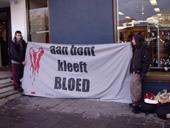 De aktivisten hebben echter wel meer gedaan als leuzen roepen, en wel met een goede reden. Wanneer er wordt geflyerd komt oom agent altijd weer de boel verstieren (arrestaties, weggestuurt worden etc.), dit terwijl RvD op een nette manier alleen probeert de consument in te lichten over hoe het daar in elkaar steekt. Logisch dat zij dit niet pikken en een 'hardere' maar nog net zo goed geweldloze aktie voeren om zo voor beide dingen aandacht te vragen, en de politie flikt weer precies hetzelfde. Een belachelijk beleid als je het mij vraagt, wees blij dat deze aktivisten hun akties op een nette, geweldloze manier uitvoeren, en druk ze niet in een hoek door dat soort akties zo de kop in te drukken, zo laat je ze alleen maar radicaliseren, wat moeten de mensen die geslagen, gepeppersprayed etc. zijn wel niet denken? Respect voor hun geweldloosheid en standvastigheid in hun idealen en desondanks het geweld van MdB's kant EN de politie toch geweldloos te blijven, ga zo door! | | opdate arrestanten | Arrestantensteungroep Amsterdam - 15.02.2005 11:52