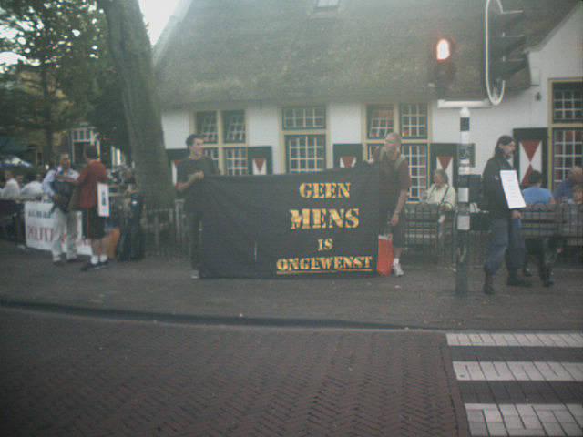Een groep van ongeveer twintig mensen heeft vandaag protest laten zien en horen voor de deur van cafe Het Bonte Paard in Laren waar Verdonk was uitgenodigd voor een politieke discussie. Zie: http://www.indymedia.nl/nl/2005/09/30213.shtml Een kleine groep mensen heeft de hele avond gepicketlined met spandoeken "geen mens is ongewenst", "vluchtelingen zet je niet op straat" en borden, die herinneren aan de deportatie van Wessam op bevrijdingsdag en de deportatie onlangs van een Afghaanse jongeman (geboeid aan handen voeten en mond afgetaped tijdens vlucht van 8 uur). Het zijn namelijk precies de persoonlijke verhalen waar Verdonk tijdens discussies niet op in wenst te gaan. Behalve dus dat zij discussiepartners weigert, heeft zij ook op deze manier invloed op elke discussie en elk interview dat ze geeft. Wij kwamen haar er aan helpen herinneren dat haar mensenrechten schendende politiek niet wordt vergeten, en haar slachtoffers ook niet. Ook al doet ze nog zo haar best om alles in de doofpot te stoppen. Bij aankomst Verdonk werd gescandeerd oa. Stop Deportaties, dat mocht al snel niet meer (de burgermeester van Laren himself was ons ook al komen vertellen dat er geen lawaai mocht) en er werd door politie een einde aan gemaakt. Toen zetten we het zingen in van het lied Laat ze zelf vertrekken en na het tweede refrein greep politie de gitaar vast en we moesten stoppen want anders werden we aangehouden, zo werd gedreigd. We zijn tijdens de hele avond voor de deur blijven staan, sommigen van ons symbolisch met tape op de mond. Pamfletten uitgedeeld en onzinnige opmerkingen van terraszitters van het cafe aangehoord. Binnen was af en toe wat applaus te horen, maar je hoefde het niet te wagen van buiten ook maar iets te roepen als een simpel BOE Een aantal mensen zijn naar binnen gegaan bij aanvang ,en hebben flink de mond geroerd, de IND aangeklaagd etc. Ze hebben Rita als altijd horen liegen en ze ging nergens inhoudelijk op in. Zoals ik hierboven al schreef. Iemand die binnen was geweest mocht na buiten te zijn geweest en met een van ons gepraat te hebben, niet meer naar binnen. Dat was een beveilingsrisico zeiden ze. Binnen heeft Rita dus goed weerwoord gehad van een aantal mensen uit Friesland en ik heb begrepen dat asieladvokaat Bogaers ook goed zijn mond heeft geroerd. Bij het vertrek van Rita hebben we het scanderen en fluiten herhaald. De politie begon meteen te duwen. Het stikte er van allerlei soorten politie en beveiligingsfiguren. Al met al geslaagd, al waren we nogal in de minderheid maar wel vastberaden: een ding moge duidelijk zijn: het zal Verdonk niet lukken om stilletjes door te gaan met haar misdadige praktijken. We blijven aanklagen! joke ps. er komen nog foto's volgens mij E-Mail: joke.kaviaar@zonnet.nl Website: http://www.jokekaviaar.nl |