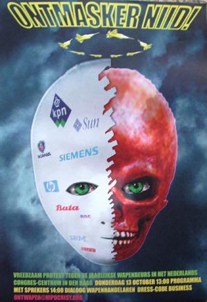 In de avond van donderdag 29 september hebben activisten van Onkruit verfbommen gegooid tegen de gevel van het kantoor van de NIID (Nederlandse Industriële Inschakeling Defensieopdrachten), de branche-organisatie van Nederlandse bedrijven die voor de defensiemarkt werken. De NIID is de overkoepelende organisatie van Nederlandse bedrijven die voor de defensiemarkt produceren. Zij probeert in het algemeen militaire orders voor deze bedrijven binnen te halen en is een intermediair tussen defensie, politieke en bedrijfsleven. Elk jaar in oktober organiseert de NIID een symposium en beurs ('promovloer') voor de Nederlandse defensie-industrie. Het thema van het symposium van dit jaar, op donderdag 13 oktober a.s., is 'marktplaats.eu'. Een mooie aanleiding voor een aktie tegen de NIID. Onkruit keert zich, net als vele andere organisaties en individuen, met kracht tegen wapenhandel en militaire beurzen. Wapenhandelaren verdienen grof geld aan de dood of verminking van talloze mensen. Mede dankzij hen worden oorlogen, andere gewelddadige conflicten en situaties van onderdrukking in stand gehouden. Bovendien kunnen de enorme bedragen die omgaan in de wapenhandel veel beter gebruikt worden voor zaken als armoedebestrijding en ontwikkelingssamenwerking. Volgens de Ontwikkelingsorganisatie van de VN (UNDP) zullen de Millennium Doelstellingen - gericht op het elimineren van extreme armoede - niet gehaald worden als de bewapeningsuitgaven niet worden beperkt. E-Mail: onkruit@puscii.nl Website: http://www.contrast.org/onkruit |