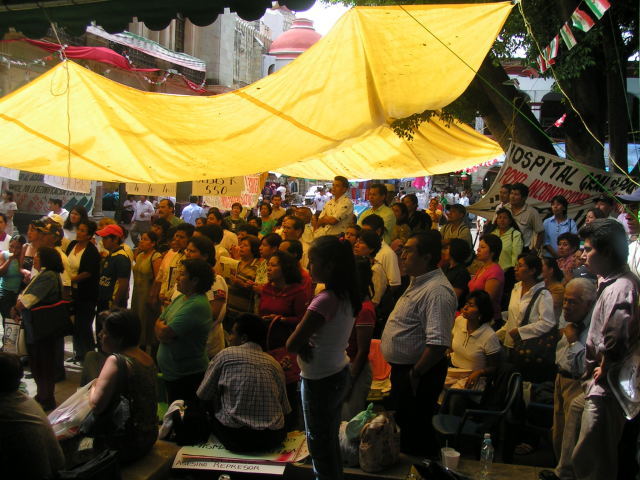 De situatie in Oaxaca lijkt steeds meer in een impasse te raken. De regering wil blijven onderhandelingen en de huidige gouverneur Ulises Ruiz Ortiz een hand boven zijn hoofd houden. De APPO (Asamblea Popular de los Pueblos de Oaxaca) wil echter dat hij afreed en zetten vandaag hun eis kracht bij door alle overheidsgebouwen te bezetten.  Stadhuis wat al 4 maanden bezet is  Zocalo Oaxaca  Tientallen tentjes bij de Zocalo Voor meer achtergrondinformatie over de situatie in Oaxaca: