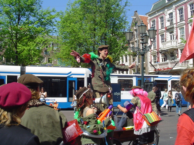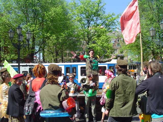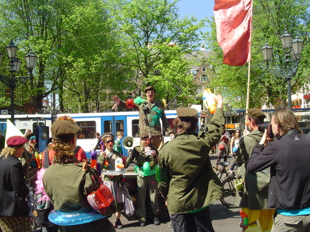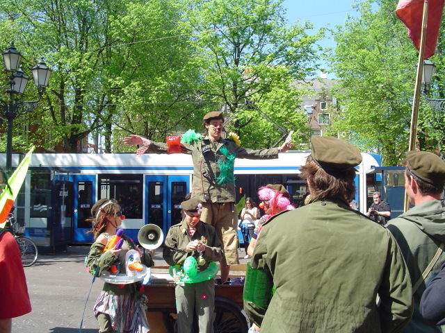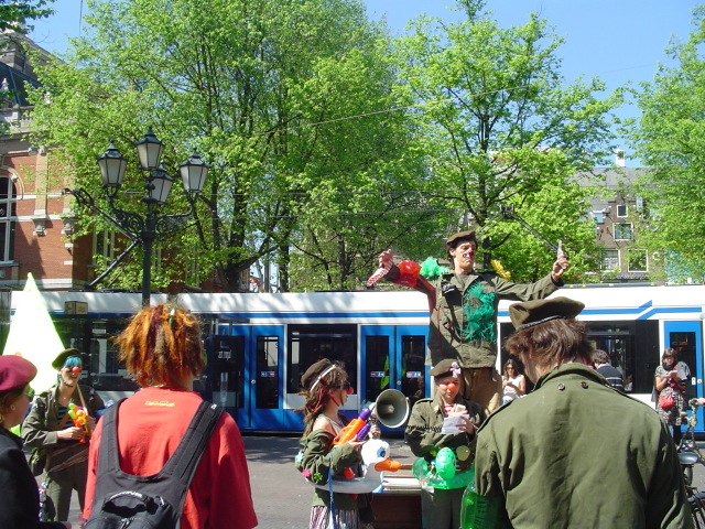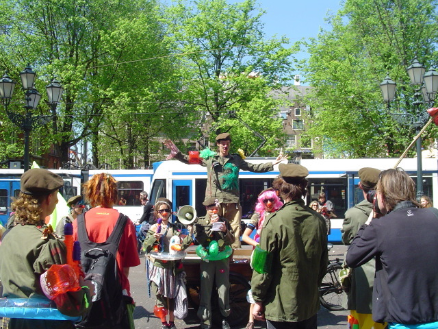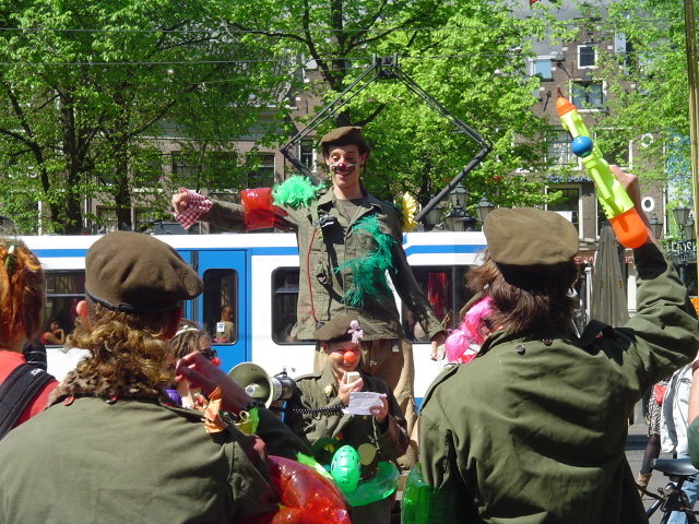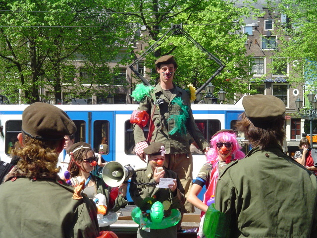 Vanaf heden zal 1 mei door het leven gaan als dag van de Clowns en hun Clown -revolutie. En niet meer als dag van de arbeid. De revolutie is begonnen op het Leidse Plein in Amsterdam en wordt op dit moment verwoed voortgezet door iedereen die er bij was. Als een olievlek breid het zich uit. Steeds meer mensen zijn gaan spelen. Voorbijgangers die hun toeristische wandeling onderbraken voor een waterspel met de clowns, straatvegers die hun werk neer legden om te kunnen spelen. Zelfs terrassen die leegstroomden, kroegen die uitliepen, mensen die hun kantoren verlieten, automobilisten die hun auto's aan de kant zetten, taxichauffeurs en bouwvakkers die hun werk neer legden etc. etc.(...? euh...), allemaal om mee te kunnen doen met de Clownrevolutie! Met andere woorden, het was en is een zeer groot succes. En natuurlijk was het ook voor de kinderen een groot succes, omdat zij eindelijk de steun kregen die ze verdienen. Eindelijk zijn de kinderen niet meer de enigen die willen gaan spelen. Zoals we al noemden breidt de revolutie zich op dit moment alleen nog maar uit. Steeds meer steden volgen met spelen. Niet alleen met waterballonnen, maar ook andere spellen. Er komen zelfs al steeds meer geruchten binnen dat ook in het buitenland wordt gespeeld. Een groter succes had CloLoNeL zich bijna niet kunnen wensen. Er was slechts een klein min puntje, namelijk dat de politie niet heeft willen meespelen. De clowns kregen zelfs niet de kans om de agenten uit te nodigen voor het spel, omdat ze angstvallig in hun autootje bleven zitten. Vervolgens gingen ze maar weer snel weg en hebben we ze niet meer gezien. Oppergeneraalmaarschalkkapitein Blup heeft een indrukwekkend manifest voorgedragen, wat nog meer publiek deed aantrekken en overtuigen. En na het zingen van de Clown Internationale, iedereen zong in uitermate zuivere toon mee, barste het spetterende feest los. Daarbij werden massaal leuzen geroepen als 'Leve de Clown Revolutie!' en 'Iedereen heeft het recht om te spelen!' Na nog in de Burger King het water bevrijd te hebben (in samenwerking met het Water Bevrijdings Front) om zo nog meer waterballonnen te kunnen rond gooien en met waterpistolen te schieten, hebben de clowns het plein uiteindelijk verlaten, toen duidelijk werd dat de revolutie werd voortgezet. Een afsluitende speech van de oppergeneraalmaarschalkkapitein deed mensen nog genoeg opzwepen om op eigen kracht verder te gaan. En zo ging een leuke middag weer snel voorbij.... | | stille getuige | Elfie Tinkel - 03.05.2007 21:24