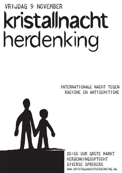 Kristallnacht herdenkingsoptocht Internationale nacht tegen racisme en antisemitisme vrijdag 9 november, 20:00 uur, Grote Markt, Groningen Diverse sprekers  Op 9 november 1938 werden in Nazi-Duitsland bezittingen van joden, zigeuners, homoseksuelen en andersdenkenden voor het eerst systematisch en massaal vernield. Deze dag is daarmee een symbool geworden in de strijd tegen vervolging van groepen overal in de wereld wegens afwijkende afkomst, geaardheid en ideeën. Ook in onze tijd worden er nog steeds mensen om deze reden anders behandeld dan anderen, ook in Nederland. Zo is er twee jaar geleden in Nederland een nieuwe wet ingevoerd waarin een identificatieplicht werd ingesteld voor personen vanaf 14 jaar. Deze wet roept nare herinneringen uit het verleden op. Het is op zich al een beangstigend idee dat iedereen zonder enige reden kan worden staande gehouden door de sterke arm om zich te identificeren, maar er blijkt nu in praktijk geen garantie dat niet alleen andersgekleurden of "alternatief' -geklede personen zullen worden gecontroleerd. Wie kan garanderen dat niet alleen groepjes Marokkaanse jongeren, maar ook autochtone blanke jongeren worden staande gehouden? We hebben al kunnen zien dat bij preventief fouilleren selectief te werk wordt gegaan door de politie. Deze nieuwe wetten zijn een uitvloeisel van een algehele verrechtsing in de Nederlandse samenleving en in het bijzonder in de Nederlandse politiek. Uitspraken waar de heer Janmaat van de Centrum Democraten nog voor vervolgd werd zijn inmiddels dagelijks taalgebruik geworden door veel Haagse politici, zoals Wilders en Verdonk, maar ook door partijen als VVD en CDA. Zou dit zijn wat Balkenende en consorten bedoelen met normen en waarden? Mensen anders behandelen, omdat ze een andere afkomst hebben. Mensen anders behandelen, omdat ze er anders uitzien. Mensen anders behandelen, omdat ze sociaal zwakker zijn. Laten we de strijd niet opgeven en blijven vechten voor een wereld waarin iedereen zichzelf kan zijn. Website: http://www.kristallnachtherdenking.nl |