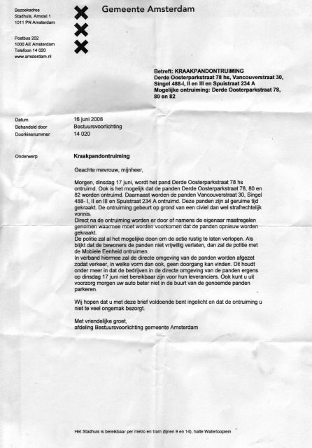 Dear All, Singel 488, 490 etc. will be evicted tomorrow morning on the basis of a 138 judgement that we are still fighting in court. Given all the problems the authorities have had recently due to a lack of communication with squatters, it is unbelievable that they then order an eviction on the basis of the the supposed use of the building by a company that recently sold it. There will be a protest tomorrow morning, outside Singel 488. It will begin at 5am, but as we don't know what time the eviction will be, it could carry on all day. So if you wake up at 7 - still come along! Check Indymedia for the eviction time-line. Free coffee and breakfast will be provided. I hope to see you all there! Bewoners. | | Gemeente bericht | prt - 16.06.2008 16:55