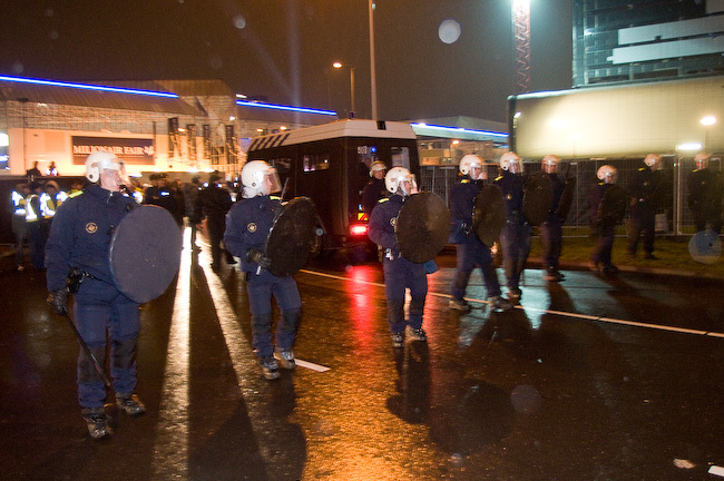 Zo'n vijftig actievoerders hebben donderdagavond lawaai gemaakt voor de hoofdingang van de Miljonair Fair. Nog een groep van gelijke omvang, waaronder anarchisten, werd tegengehouden door een linie ME.  Tientallen vierdeurs wagens vervoerden op bestelling miljonairs naar de RAI De betogers die het dichtst bij de entree van de RAI stonden, hadden hiervoor vooraf toestemming gevraagd. Diverse organisaties, waaronder de SP, de Bijstandsbond en Internationale Socialisten, produceerden tussen 19:30 en 21:30 achter de hekken een fluitconcert waarmee de rijke stinkerds werden onthaald. Een groep van vijftig anarchisten verzamelde zich op dat moment bij station RAI, naar aanleiding van een oproep van de Ongenode Gasten. De meeste aandacht voor de politie ging naar deze actievoerders uit, vanwege reële kans op verstoring van de openbare orde. In de oproep werd immers opgeroepen om de Miljonair Fair 'te verstoren, blokkeren, verpesten en te bestormen'. Begeleid door de ME en politie te paard begaven deze betogers zich rond 20.45 naar de hoofdingang van de RAI, waar de ME een linie formeerde zodat de groep buiten de tweede beveiligingsring kwam te staan, uit het zicht van de bezoekers van de beurs. Met een handmatig aangedreven luchtsirene werd een beangstigend lawaai geproduceerd, tot ver in de omtrek hoorbaar. De aanvoer van de genode gasten werd vanaf dat moment verstoord, en verlegd naar ingang P9 in de Wielingenstraat. Op de Miljonair Fair wordt door de 'top van de internationale luxe-industrie' exclusieve producten en diensten aan de man gebracht. De demonstranten vinden het niet kunnen dat mensen van gekkigheid niet weten wat ze met hun bergen geld moeten doen, terwijl miljoenen mensen zich grote zorgen maken over de gevolgen van de economische crisis. |
