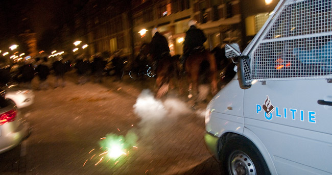 sinds een uur ongeveer is het ME-circus klaar met ontruimen van de vanmiddag gekraakte etages Commelinstraat 21-1, 43-1 en 47bel. er zijn ongeveer 25 mensen opgepakt toen ze nog binnen waren na sommaties te vertrekken. de woningen zijn van woningbouwcorporatie de key/principaal. nadat ze in 2007 gerenoveerd zijn, werden deze voormalige sociale huurwoningen te koop aangeboden. toch bleven ze leegstaan, blijkbaar te duur....omdat de key beweerde dat de woningen minder dan een jaar leegstonden, vond burgemeester cohen het gerechtvaardigd het ME-circus incl paarden, paraat vanwege een voetbalwedstrijd, op te trommelen voor een instand-ontruiming. meerdere verklaringen van buren dat de woningen langer dan een jaar leegstonden wogen niet op tegen een verklaring van een a-sociale woningbouwvereniging. nu zijn de woningen weer leeg en zit er bewaking in. | | Arrestantengroep | Arrestogroep - 13.04.2009 01:03