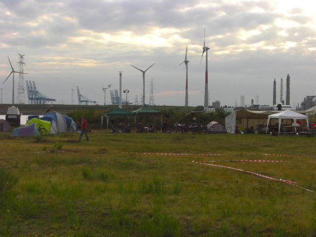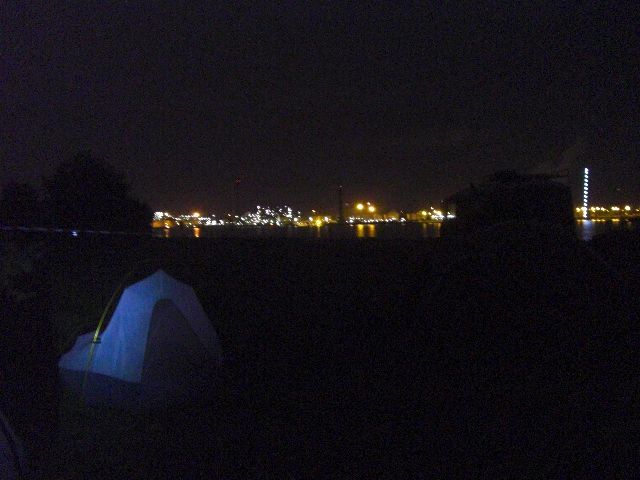 Dit is het zicht vanuit het kamp 's nacht. De ene kant van het kamp is mooie natuur en de overkant van het kanaal staat vol met vervuilende industrie en transport. Op de voorgrond zie je nog net een koepeltentje | | Infonummer! | KlimaatKamp - 02.08.2009 18:47