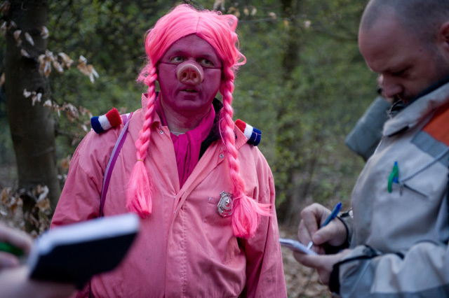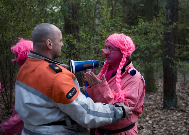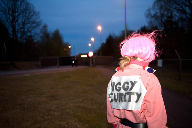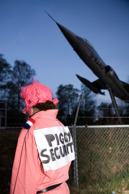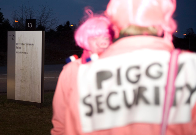 Thursday night April 15th: a big emergency exercise in detention centre Camp Zeist. Police, fire brigade, ambulances, fake activists, etc. Because the real disaster is people are kept there only because they don't have papers the emergency exercise clearly needed some extra help: officials from the Anarchistic Anti-deportation Group Utrecht and Piggy Security from Rebelact. Text in Dutch will follow / Nederlandse tekst volgt nog The emergency exercise already started around 18.00 An hour later a first extra group of officials tried to enter the detention centre at the main entrance. Later followed by the Piggy Security near the area of the barracks. By megaphone just one thing should be loud and clear - the emergency exercise should have just one order: free all people who are locked up immediately! However with all these good intentions the police was the participating organisation who destroyed the helping hands of the officials from AAGU and the Piggy Security from Rebelact. They came with several police cars and vans, even one with nice doggies - to interrupt the useful work done by the extra groups who tried to participate in the exercises. They checked the Piggy Security about their ID's and had long tel. calls to hear if the Piggy Security should be part of the emergency exercise. Somewhere a misunderstanding arrised: the cops thought the Piggy Security weren't part of the exercise... How wrong can you be! They checked and double checked, but finally the commander in chief said the Piggy Security should leave the area near the barracks. After also photographers and the filmer were ID-checked and a few speeches and some heavy noise the Piggy Security left and walked in the direction of the main entrance. Of course followed by a police car. Again ID-checks and a conversation about the detention centre with the people in uniforms. The Piggy Security made clear what the intention should be of the emergency exercises: free all people without papers now! It's a pitty the exercises didn't develop that way - because police clearly didn't understand the work of these extra participating groups. But a few cops were in doubt. Somewhere in their faces you could see: "These groups are right with their view about the crazyness of being detained simply because you don't have the right papers". So maybe we've to exercise again to open the minds of the police and more important: to open the gates!!! Pictures and film will follow E-Mail: rebelact@ddh.nl Website: http://www.rebelact.nl |