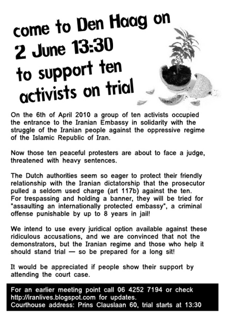 On April 6, 2010, part of the Iranian Embassy in the Hague was occupied by a group of ten protesters. They will stand trial on Wednesday at 13h30 in the Hague. They are accused of "violence" against a flowerpot and a door, and of insulting the flag of the Islamic Republic of Iran, and due to a bizarre array of juridical twists this could result in a trial for "assaulting an internationally protected embassy" and result in 8 years in jail.  The trial is open, and support from the community would be appreciated. This is as simple as attending the court case. We are hoping that this will not be the last court date, and that the actual result is far different from the draconian possibility which has been presented. So we're not asking anybody to lose his or her job or cancel other urgent matters to come and be present; still, in the worst case that a speedy prosecution and heavy sentence result, it would be a shame to not let the judge, the press and the public hear the voices of dissent, or to not let the protesters hear friendly voices of encouragement. If the cost of the train is the only thing holding you back, please call 06 42 52 71 94 and we can work something out. The group, consisting of Iranians and non-Iranians, carried out the action to protest the grave human rights situation in Iran. The last year has seen a huge rise in forced disappearances, torture, executions, and clampdowns on freedom of expression, association, and thought. - - - - Occupation Statement April 6, 2010 Today we have occupied part of the Iranian embassy in The Hague, in solidarity with you, the people of Iran, who in the past months have witnessed such a level of brutality and barbarity from your "rulers", that the world can see once and for all how illegitimate they truly are. The world is watching, and acting. The demonstrators in Iran are being joined by increasing numbers from Stockholm to Paris, The Hague, and Berlin, who have [...] [ more at http://iranlives.blogspot.com ] E-Mail: plaguethehague@gmail.com Website: http://iranlives.blogspot.com |