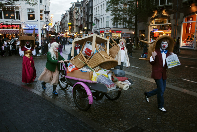 A beautiful spot at the Dam square was already empty for years, so the protest against the anti-squatting law in Amsterdam on Saturday, Sept 25th was the Right time to squat! As rebel clowns we squatted the place for a long, inspiring night and established our Home Sweet Squatted Home. Nederlandse tekst volgt nog / Dutch text will follow. We celebrated the 'anti-anti-squatting' law which will hopefully give more space to people who need to live somewhere. The good news is: waiting 1 year to use an empty building is no longer needed! So maybe everything will turn out fine with that new OUTlaw! First we had some ideas to use our brandnew squat at the Dam for our own rebellious clown activities, but with many of hundreds protesting people in 'our garden', we had to adapt. Being flexible is also a clown quality. That's why our space quite soon changed into a lively living room: loads of visitors chatting and drinking with us, for a while we were guesthouse for someone lightly wounded, nice musicians playing guitar in and nearby our home, someone gave us her very big delicious birthday cake (Thanks and congratulations!), we received 2 books (one from John Irving and another about summit protests. Great!) and of course we also killed time with giving interviews. We were in good company: several visiting people showed rebellious respect by wearing a red nose! You'll understand it was a great night which made perfectly clear squatting will go on! There's a lot of work to do. You don't need to look very far. At the Dam square: a nice palace and a big office. Both empty! And a bit further you'll find much more spaces screaming to get used! Enjoy that new OUTlaw! Pictures and film will follow. E-Mail: rebelact@ddh.nl Website: http://www.rebelact.nl |
