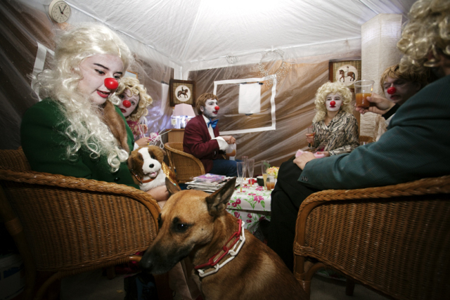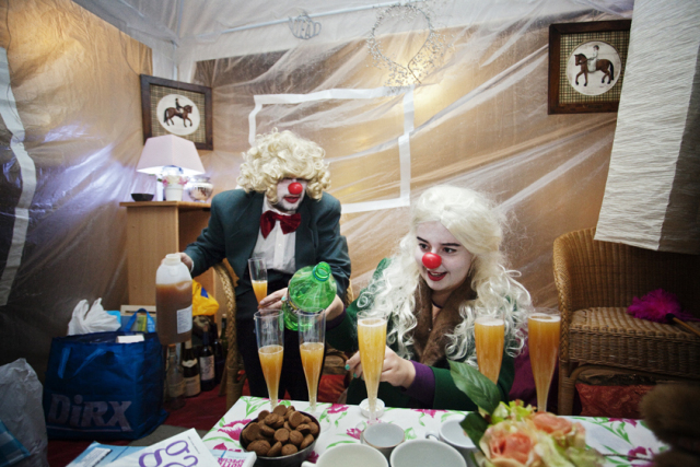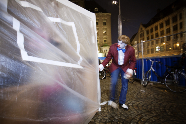 Een prachtige plek op de Dam stond al jaren leeg, dus het protest tegen de anti-kraakwet op zaterdag 25 september in Amsterdam was het juiste moment om het te kraken! Als rebel clowns kraakten we de plek voor een lange, inspirerende nacht en vestigden we er ons Home Sweet Squatted Home. We vierden de 'anti-anti-kraakwet' die hopelijk meer ruimte geeft aan mensen die ergens moeten wonen. Het goede nieuws is: 1 jaar wachten om een leeg gebouw te kunnen gebuiken, is niet meer nodig! Dus misschien komt alles wel goed met die niewe ONwet! Eerst hadden we wat ideeën om ons gloednieuwe kraakpand op de Dam te gebruiken voor rebelse clown activiteiten, maar met honderden protesterende mensen in 'onze tuin', moesten we ons aanpassen. Flexibil zijn is ook een clown eigenschap. Daarom veranderde onze ruimte vrij snel in 'n levendige woonkamer: talloze bezoek(st)ers die met ons spreken en drinken, korte tijd waren we gastenverblijf voor iemand die licht gewond was geraakt, goede muzikanten die in en bij ons huis gitaar speelden, iemand gaf ons haar heel grote verjaardagstaart (Bedankt en gefeliciteerd!), we kregen 2 boeken (een van John Irving en een ander over top protesten. Geweldig!) en natuurlijk kwamen we de tijd ook door met het geven van interviews. We waren in goed gezelschap: verschillende mensen die ons bezochten, toonden rebels respect door een rode neus te dragen! Je begrijpt dat het een fantastische nacht was die perfect duidelijk maakte dat kraken doorgaat! Er is een hoop werk te doen. Je hoeft niet heel ver te kijken. Op de Dam: een leuk paleis en een groot kantoor. Allebei leeg! En een beetje verder vind je nog veel ruimtes die schreeuwen om gebruikt te worden! Geniet van die nieuwe ONwet! Film volgt nog E-Mail: rebelact@ddh.nl Website: http://www.rebelact.nl | |