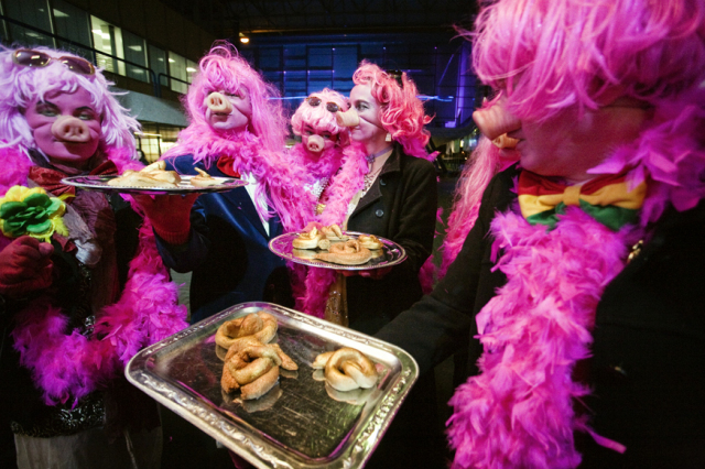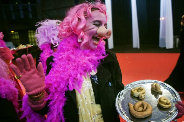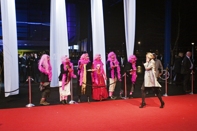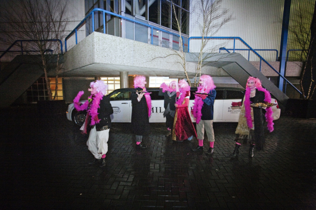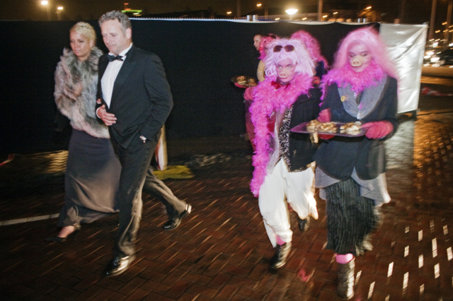 Donderdagavond, 9 december. Het was beslist 'n heel speciale avond. Brooke Shields was in Amsterdam om de jaarlijkse Miljonair Fair te openen op het RAI-tentoonstellingscentrum. De opening was heel exclusief: alleen voor genodigden! Het was dè plek om te zijn voor de rijken en welvarenden. De markt waar je alles kunt kopen dat je absoluut niet nodig hebt. Dit jaar werd een nieuw product gelanceerd: een product dat iedere miljonair onmiddelijk zou moeten kopen: Gouden Shit! Als je alles in je leven al hebt, dan is er nog maar één ding dat je mist: een prachtig stuk Gouden Shit! De Piggy Miljonairs gingen naar de beurs om te handelen met degenen die zich Gouden Shit kunnen veroorloven. Op de openingsavond passeerden honderden miljonairs de rode loper en verschillende van hen toonden belangstelling in dit wonderlijke nieuwe product. De Gouden Shit werd in diverse maten gepresenteerd op prachtige exclusieve zilveren dienbladen. Sommige shit was oorspronkelijk van beroemdheden. Natuurlijk hadden we een grote van Booke Shields, maar er was ook een kleine, koninklijke. Topkwaliteit soliede Gouden Shit! Prijzen die beginnen bij 500.000 Euro en stijgen tot meer dan 2 miljoen... maar dan heb je ook iets heel speciaals! Het is ook 'n geweldig kerstgeschenk voor je tweede of derde vrouw! De Piggy Miljonairs verzorgden enthousiaste statements over dit absoluut fantastische product. Soms schreeuwden ze zelfs: "Laat zien dat je een miljonair bent! Vergeet de rest van de shit op deze beurs! Ga voor het echte spul: koop Gouden Shit!" Hoe dan ook: Gouden Shit is de investering die we nu in deze chaotische tijden van permanente economische crisis nodig hebben. De meeste miljonairs begrepen de enorme mogelijkheden van Gouden Shit. Daarnaast waren ze speciaal geinteresseerd in de 10% korting - alleen tijdens de openingsavond! Bijvoorbeeld: een speciale aanbieding - niet 1.000.000, maar slechts 900.000 voor een van de beste stukken Gouden Shit. Er was maar 1 miljonair (of was het iemand van de organisatie van de beurs?) die een beetje jaloers was en met zijn rechtervoet tegen een van de dienbladen schopte zo hard als hij maar kon. Hij was duidelijk boos. De shit vloog alle kanten uit. Gelukkig overleefde de sterke Gouden Shit en konden de Piggy Miljonairs doorgaan met aandacht vragen voor het ultieme gadget. Ook de security twijfelde: wat te doen met zoveel aandacht van miljonairs voor het nieuwe product op de rode loper? Ze besloten om er niets mee te doen. Wat een goede beslissing was. Anders hadden de Piggy Miljonairs nog meer media aandacht gekregen. De succesvolle lancering van het geweldige hebbeding nam meer dan 45 minuten in beslag. Rond 21.15 uur waren bijna alle miljonairs bij de beurs binnen en werd het tijd om naar huis te gaan en iets te drinken om de fantastische introductie te vieren van dat prachtige product Gouden Shit. De Piggy Miljonairs verlieten het gebied. Een paar minuten later kregen ze nog een speciale groet van een politieauto met zwaailicht. Hoewel ze probeerden hen te volgen, lukte het niet om dicht te naderen en c(l)o(w)ntact te maken met de Piggy Miljonairs. Waarom? Ineens waren de Piggy Miljonairs verdwenen... maar de Gouden Shit zal zeker blijven en zijn weg vinden op de Miljonair Fair! Foto's en film volgen E-Mail: rebelact@ddh.nl Website: http://www.rebelact.nl | | foto's | ... - 10.12.2010 12:27