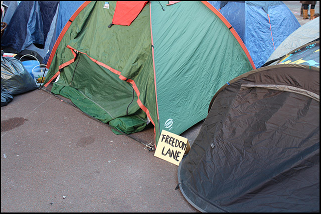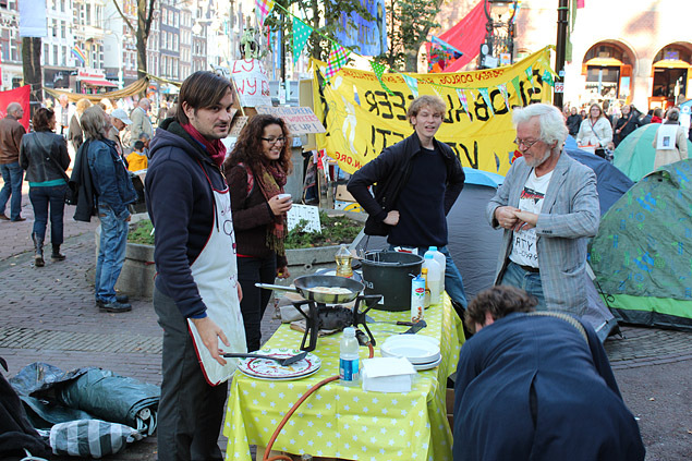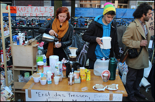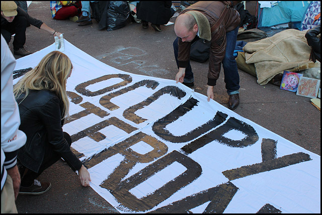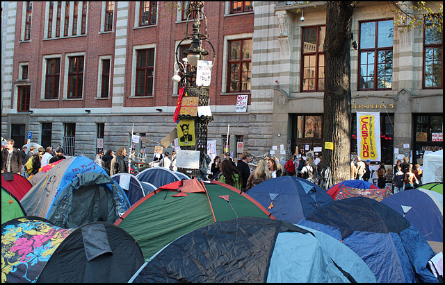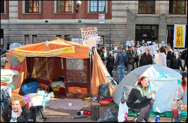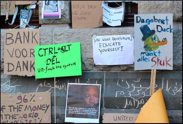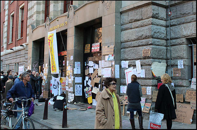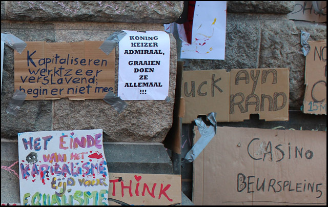 De Beursplein bezetting gaat bijna haar derde dag in. Hieronder foto's van de tweede dag:               Mooi om te zien was de enorme hoeveelheid aan protestborden. Van reststukjes karton tot metersgroot spandoek, van prulgeschrift tot strakke letters, overal waren leuzen te zien: op bomen, lantaarnpalen, hekken, muren, ramen, auto's, mensen, tenten, op de grond en bovenal op de gevel van de effectenbeurs. [1] Dit symbool van hebzucht werd hierdoor getransformeerd tot een antikapitalistisch kunstwerk [2] met leuzen als: Follow the leaders, stop paying your bills; money = bad; Dagobert Duck maakt alles stuk; Casino Beursplein 5; Fuck Ayn Rand; Koning keizer admiraal, graaien doen ze allemaal!!!; kapitalisme = moord; Bank voor dank; Beleggen doe je maar met je brood. 1. http://antiorde.nl/fotos/bp/a5.jpg 2. http://antiorde.nl/fotos/bp/a6grt.jpg Foto's van de eerste dag: http://www.indymedia.nl/nl/2011/10/79048.shtml Website: http://antiorde.nl |