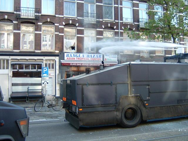 14:18 - van Hogendorpstraat: De straat is nu afgezet, de ME vormt linies. Ook veel buurtbewoners en toeschouwers er om heen. Er is een Belgische waterwerper gesignaleerd in de straat ook, Staat nu om de hoek bij de Haarlemmerweg. BraTra nog niet gezien. [foto]