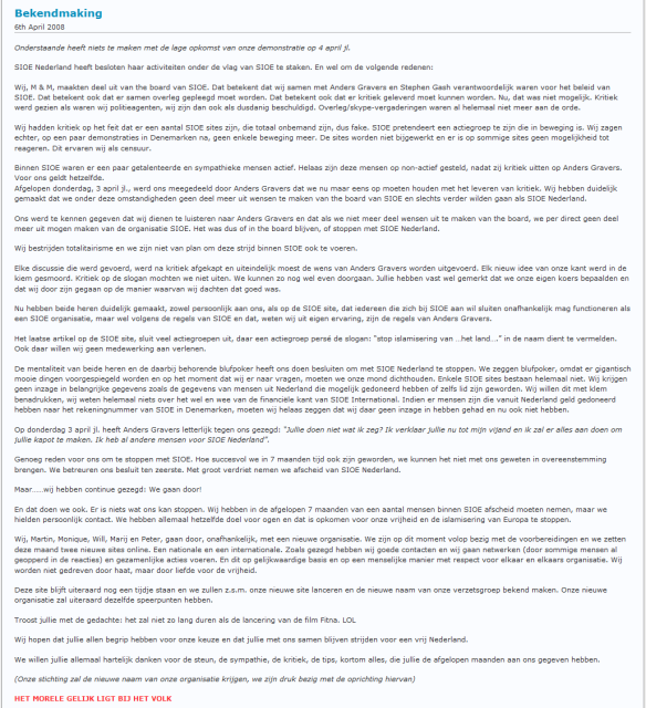 Op 26 januari 2008 organiseerde SIOE Nederland een demonstratie in Amsterdam. Enkele kernpunten waren: 'Stop de inperking van vrijheid van meningsuiting', 'Stop de inperking van vrijheid van expressie', 'Stop de bouw van moskeeën" en "Stop de islamisering'. Bij de demonstratie, die ruim een uur duurde, verschenen ongeveer veertig mensen