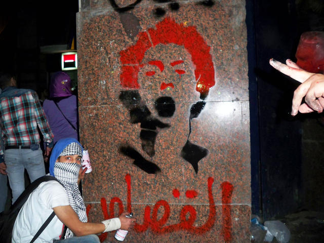 Blood, Tear gas cannister, yellow banner: Muslim Brotherhood not welcome here - Plackard: Morsi/Mubarak
