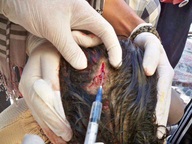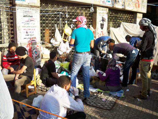 Grafittii portrait of muderderd demonstrator Mohamed Gaber, improvised hospital, medical treatment of wound.