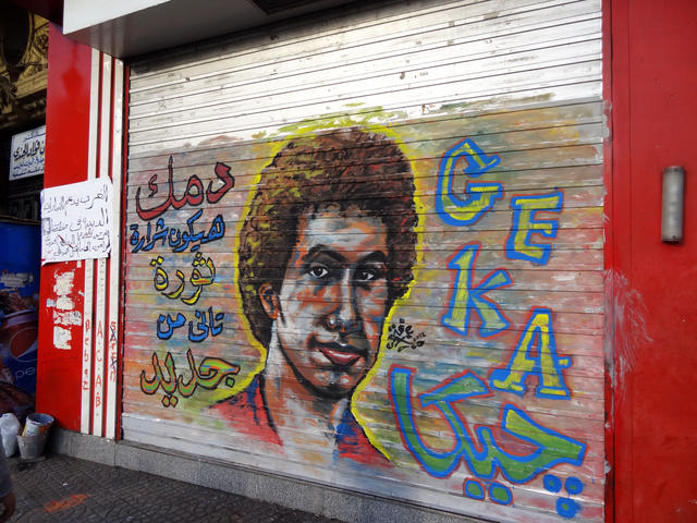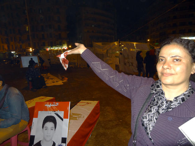 Het is indrukwekkend om de moeder te zien van een van de demonstranten die vermoord is in 2011. Ze zit op een stoel onder het portret van haar zoon afgebeeld op de enorme graffiti muur in de Mohammed El Mahmout straat. Veel mensen komen om haar eer te betuigen en omhelzen haar. Ze is niet de enige; ook de vrouwen van anderen die zijn vermoord door de politie doen mee aan de demonstratie.