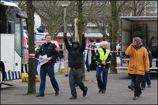 de blanke man rechts op de foto werd echter niet gearresteerd (zie voor deze discrepantie Van der Laan en de vrijheid: whites only)
