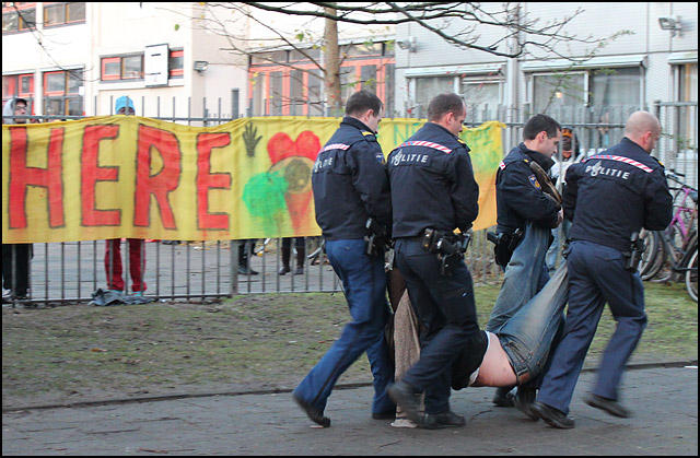 3. smeris trekt één voor één ingehaakte sympathisanten los by de ingang van tentenkamp..