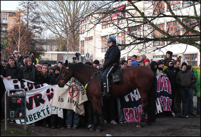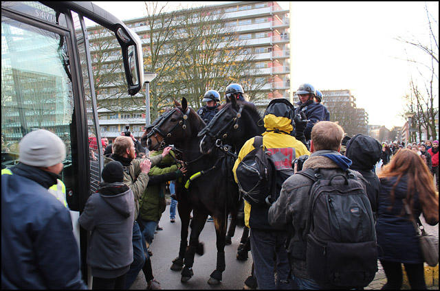 laatste pic: demonstranten blokkeren de deportatiebus van justitie waarop smeris te paard de confrontatie aangaat
