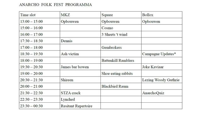 Muziek, infostands en -praatjes, vegavoedsel, speciaal bier anarchoquiz, zeefdrukken, noem maar op