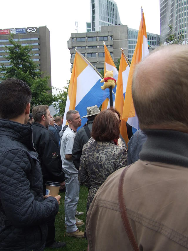 De aanwezigen – waaronder de rechts extremisten Alfred Vierling, in paarse trui en paarse zomerjasje en Florens van der Kooi, in groene zomerjas en wit shirt op foto 1 – kregen een ronkende speech van Geert Wilders te horen dat de vermeende oorzaak van de Nederlandse problemen toch vooral te herleiden zouden zijn naar de EU, de euro, de huidige VVD en PvdA coalitie en de islam. En met de bezuinigingen daar zou volgens de rechts extremist Wilders ook direct mee gestopt moeten worden.