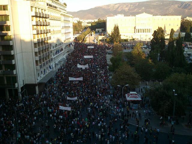 18:40 [Athene] Eerste schattingen gaan uit van meer dan 15.000 demonstranten. De mars stopte bij Syntagma omdat er constant meer mensen bij komen.