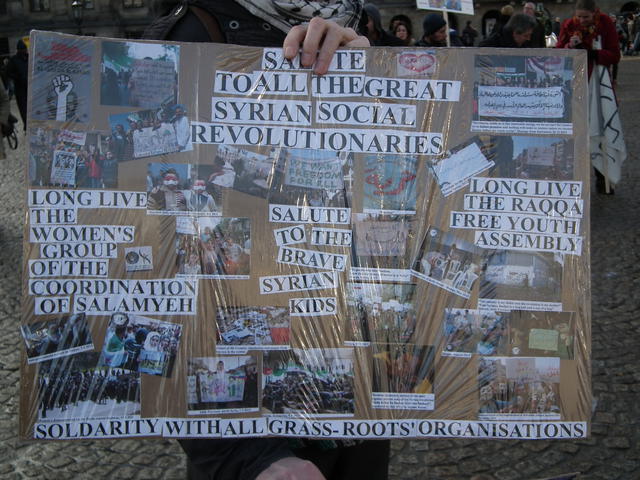 De demonstratie op de Dam was om de mensen in Syrië een hart onder de riem te steken, te laten zien dat er ook buiten Syrië mensen zijn die vinden dat het regime en islamisten moeten verdwijnen en de sociale revolutie verder ontplooid moet worden.