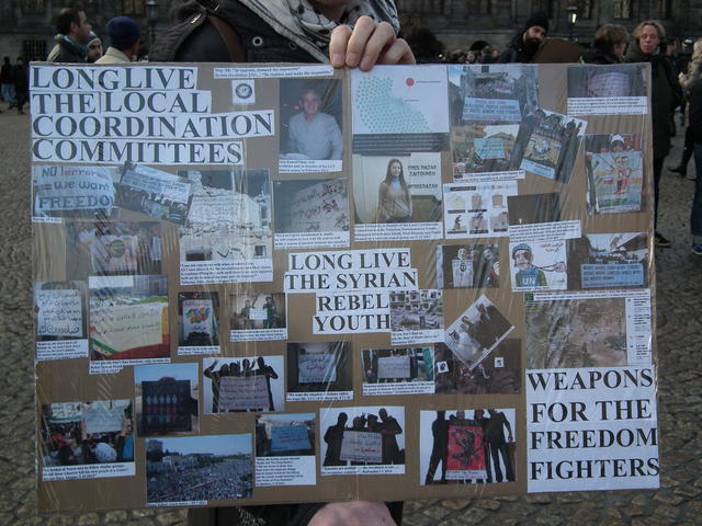 Zaterdagmiddag 11 januari verzamelden er zich vanaf 14.00 uur een honderdtal mensen op de Dam in Amsterdam om te demonstreren ter ondersteuning van de volksopstand in Syrië tegen het regime van de dictatoriale Baath-partij onder leiding van de clan van Bashar Assad.