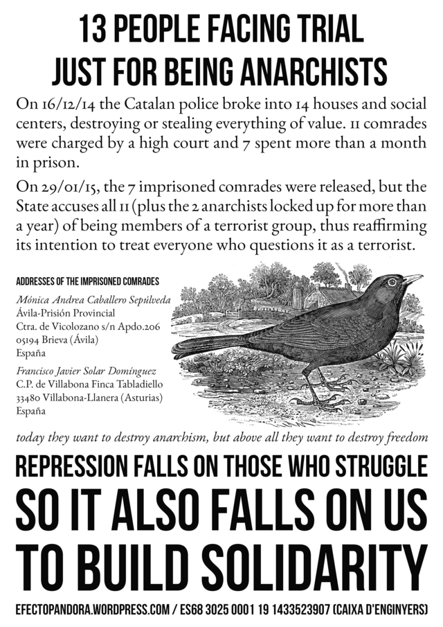 One day before, the instructing judge of the Audiencia Nacional (Madrid) permitted access to the investigative file, and what we know at the moment is what has been circulated through the website of Mossos d’Esquadra in a press communiqué. They are facing charges such as membership in GAC (Coordinated Anarchist Groups), attacks against banks, posting parcel bombs (one to the Archbishop of Pamplona, one to a member of the fascist congregation Legionaries of Christ, and others to Italian companies), while “they are linked”—always according to the police—with the explosive attacks against the Cathedral of Almudena in Madrid (February 7th, 2013) and the Basilica of the Pillar in Zaragoza (October 2nd, 2013), the latter having led to the indictment and pretrial detention of our comrades Mónica and Francisco.