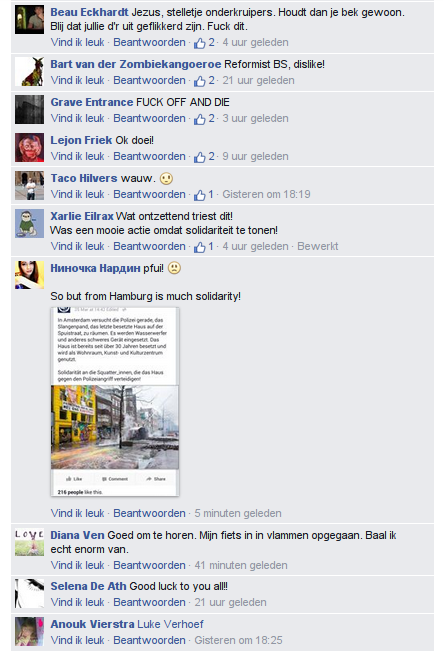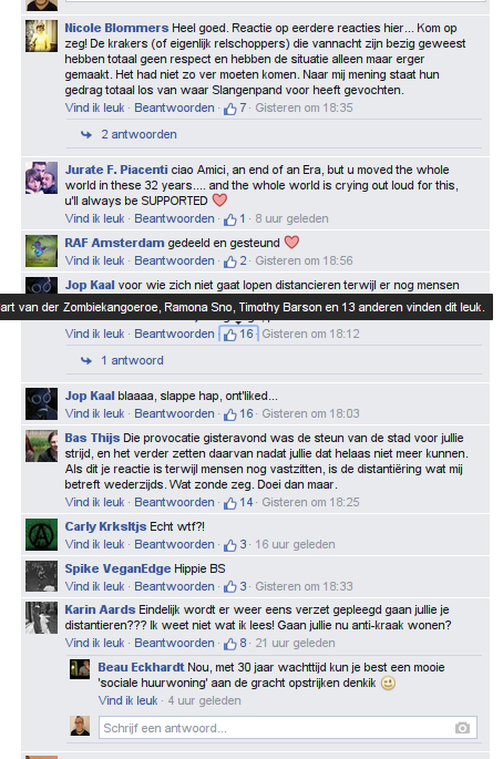 Nee, wat wij willen is een kraakbeweging waarin radicale politiek een gegeven is. In al zijn vormen, maar wel samen en solidair. Niemand zit te wachten op een club uitgerangeerde hippies die, terwijl kameraden voor hun deur op de barricaden staan, het gore lef heeft zichzelf te distantieren van het verzet dat die nacht en dag gepleegd is.