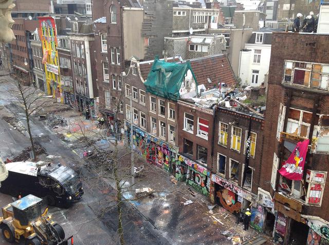 sukkels gaan weer net zo hard door met de shovel-stormram op de eerste verdieping, proberen zo te zien wel iets 'subtieler' te werk te gaan, voor zover je van subtiel kan spreken met een shovel. intussen vertrekt er ME te paard richting nieuwezijds voorburgwal.