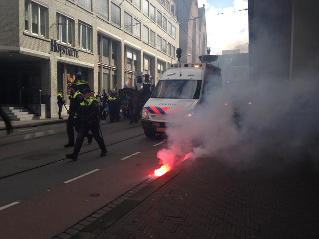 Halverwege de demonstratie van de NVU blokkeerden antifascisten de route met een spandoek met daarop de tekst “Den Haag Tegen Racisme”, fakkels werden afgestoken en de nazi demonstratie kwam tot stilstand. De politie greep hardhandig in. Met veel geweld werden de antifascisten van de weg gehaald en een aantal werden gearresteerd. De nazi demonstratie kon 15 minuten geen doorgang vinden.