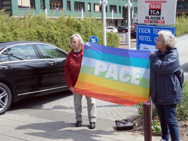 Kleine sfeerimpressie bij de demonstratie, vanmiddag, bij de entree van de aandeelhoudersvergadering van kernwapenboer Airbus in het Okurahotel in Amsterdam. Er waren zo'n 40 bezorgde mensen aanwezig om de aandeelhouders te 'verwelkomen'. Wendela de Vries van 'Stop Wapenhandel' heeft met een paar aandeelhouders gesproken. Ook heeft zij de aanwezige bezorgde mensen toegesproken en bijgepraat met achtergrondinfo over Airbus