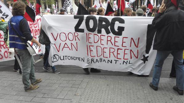 En er was alle reden om daaraan als anarchisten en verwante radicalen aan deel te nemen, met spandoeken, rood-zwarte vlaggen en flyers. Autonomen Brabant hadden een doek ‘Zorg – voor iedereen, van iedereen’. Mensen van de Vrije Bond hadden een pamflet gemaakt met een schets van de wortels van het bezuinigingsbeleid, plus de richting waarin we een oplossing konden zoeken. “De zorg, ieders zorg”, aldus de kop.