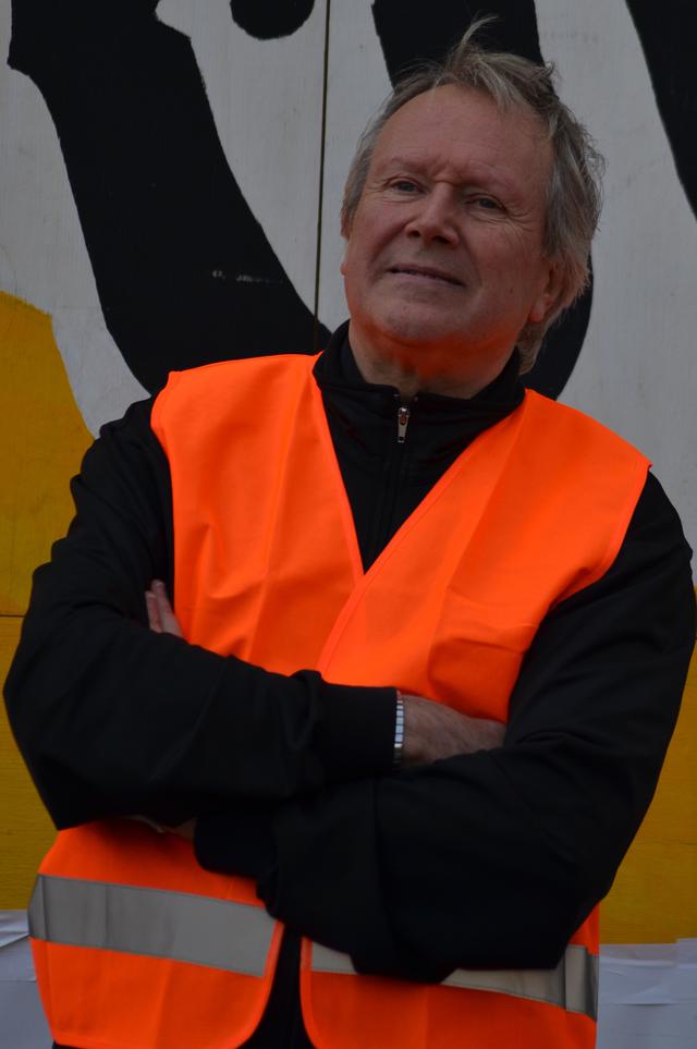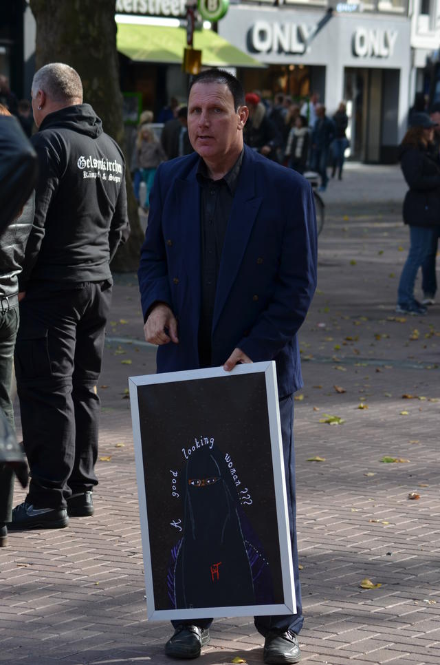 Foto 2. De Nederlandse anti-islam activist Hans van Tamelen aka Jack Terrible, bracht een zelf gemaakt kunstwerk mee naar de eerste Pegida Nederland manifestatie.