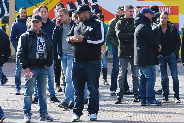 Op de achtergrond fanatieke FC Utrecht supporters die naar de PEGIDA Nederland manifestatie kwamen om rotzooi te trappen.
