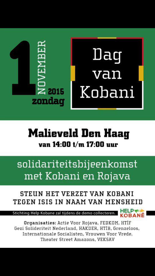 Nu is het moment waarop de wereld moet erkennen dat democratische autonomie in Rojava en het “Model van Rojava” de belofte van een vrije toekomst inhoudt voor alle Syriërs. Het is hoog tijd om niet alleen over vrede te praten maar actie te ondernemen. Kobane steunen is de vrede steunen. Wij roepen wereldwijd op om solidariteit te betonen met Kobane. Kom op straat en demonstreer mee op 1 november 2015. Join the Global Rally for Kobane