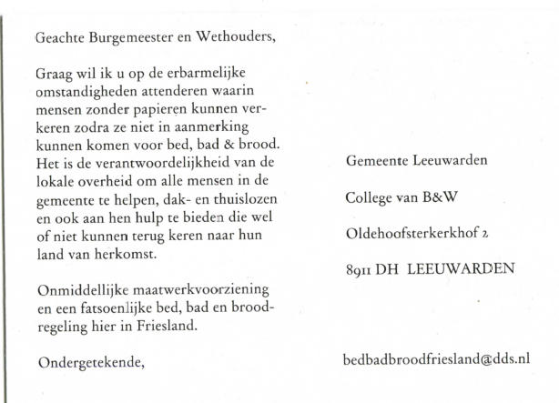 gevallen. Bed, bad en brood Friesland is tegen elke vorm van ‘administratieve ongelijkheid’ en protesteert