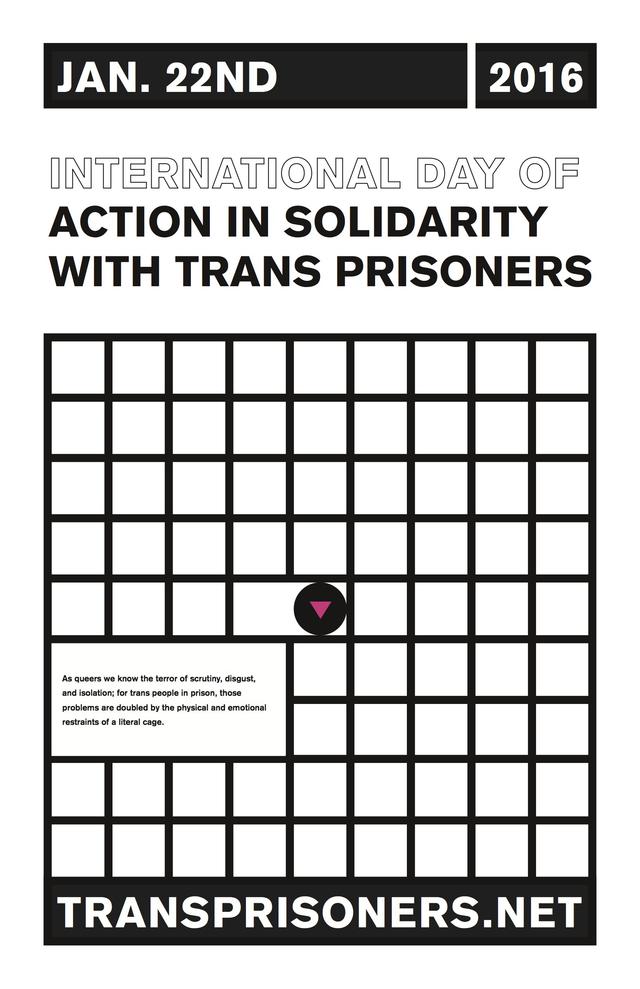 This grassroots project was initiated by Marius Mason, a trans prisoner in Texas, US. This annual event is being lead by trans prisoners and their supporters from around the world. It is a chance for those on the outside to remember those behind bars, give real solidarity and support and raise awareness about issues facing trans prisoners. It is a chance for those on the inside to have a voice and organise together.