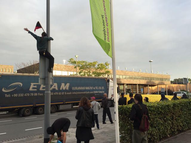 Wij waren niet enkel bij de bajes voor onze kameraad, maar ook om alle gevangen die slachtoffer zijn van dit repressieve systeem te steunen. De gedetineerden waar wij contact mee konden leggen reageerden uiterst uitgelaten op onze onze aanwezigheid.