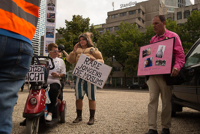 Foto 1. Het leiderschap van Pegida Nederland is, sinds het vertrek van medeoprichtster Raffie Chohan, inmiddels een Duitse aangelegenheid geworden. Van links naar rechts: de Duitse rechts-extremist Tatjana Festerling, daarnaast in grijs t-shirt de in Bastheim (Duitsland) woonachtige Nederlandse wapenhandelaar Edwin Wagensveld, daar weer naast met halflang rossig haar de Duitser Torsten Frank, vriend en organisatorische rechterhand van Edwin Wagensveld en helemaal rechts een andere extreemrechtse Duitser.