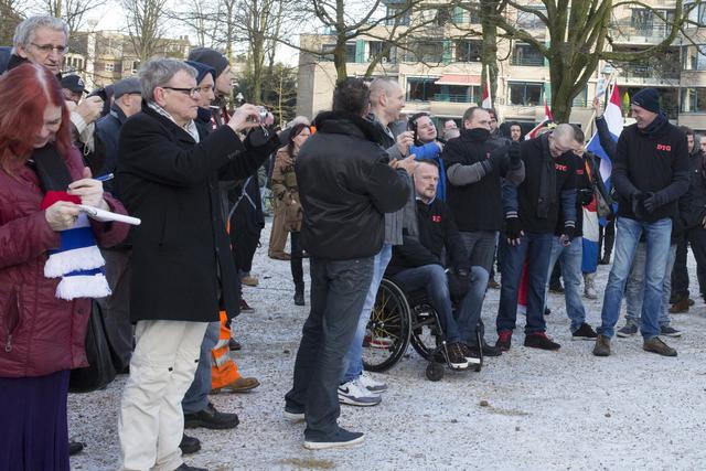 Foto 6. Tijdens de door de extreemrechtse anti-islam actiegroep Demonstranten Tegen Gemeenten (DTG) georganiseerde anti-azc-demonstratie, op 13 februari 2016 in Enschede, werden er zes extreemrechtse demonstranten gearresteerd. De heer Roy van der Hoofd, zoon van Pegida Nederland kopstuk Astrid Bello, was er daar één van.