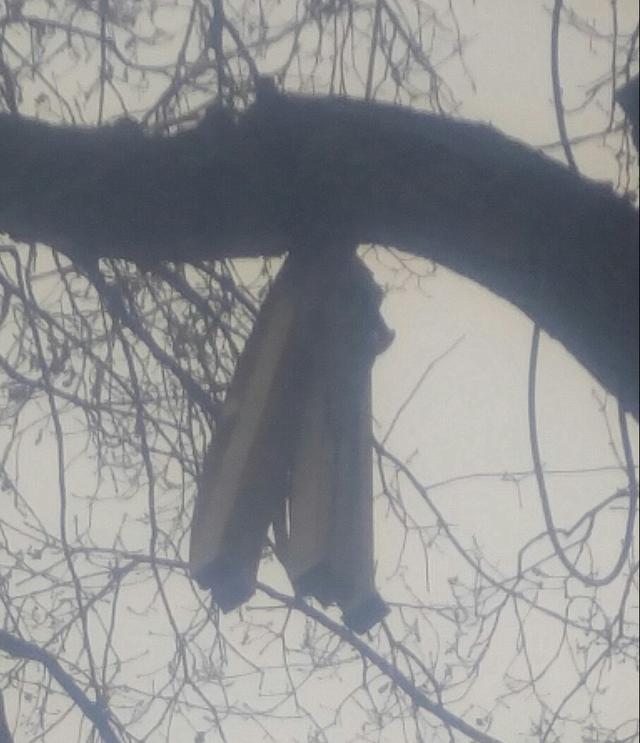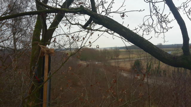 Sinds december bouwt GF! Schinveld aan een bolvormige kunstwerk in een boom. Precies op de grens waar 11 jaar geleden de kap eindigde. Het bos is eigendom van Defensie en die sommeerde hen vorige week om het bouwwerk voor dinsdag 21 februari om 12.00 uur weer naar beneden te halen. “Natuurlijk geeft GF! Schinveld daar geen gehoor aan.” reageert Rogier. “Met deze boomhut bol protesteren we tegen defensie, dat houdt niet op omdat defensie dat wil.” vervolgt hij. In de sommatie brief van 7 februari dreigt defensie het bouwwerk zelf te verwijderen.