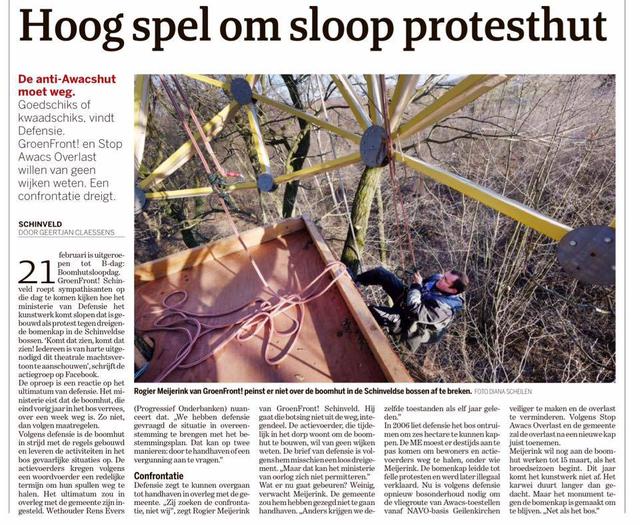 Na veel spierballentaal druipt Defensie vandaag af in Schinveld. Buurtbewoners, activisten en kunstenaars protesteren sinds begin december tegen de NAVO basis Geilenkirchen door de bouw van een bolvorming boomhut kunstwerk. Defensie had gedreigd vandaag de boomhut eigenhandig te verwijderen. Rogier: “Het was een druk bezochte dag, maar defensie schitterde door afwezigheid.”