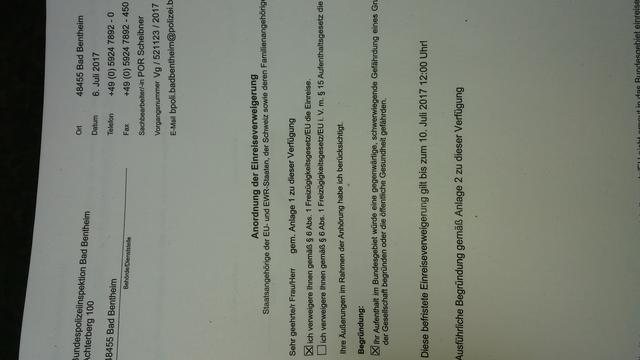 Op het politiebureau werd er medegedeeld dat we een inreisverbod kregen voor Duitsland tot 9 juli, 20:00. In de 'onderbouwing' van het inreisverbod wordt gesteld dat er vanuit gegaan kon worden dat we deel zouden nemen aan gewelddadige protesten tegen de G20 in Hamburg. We zouden deel uitmaken van de extreem-linkse scene in Nederland, illegale demonstraties hebben bezocht, bij rechtszaken in Duitsland aanwezig zijn geweest en zo gaat het lijstje met speculaties nog even door. Ook vond de politie een spandoek in de auto met de tekst: 'Against prisons, banks, the state and the world that needs them'. Alle bij elkaar gesprokkelde informatie vond de politie genoeg om ons een inreisverbod op te leggen.