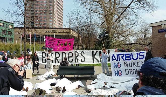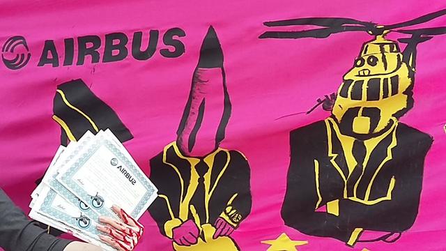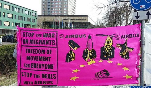 tegen de wijze waarop Airbus verdient aan de ellende van vluchtelingen.