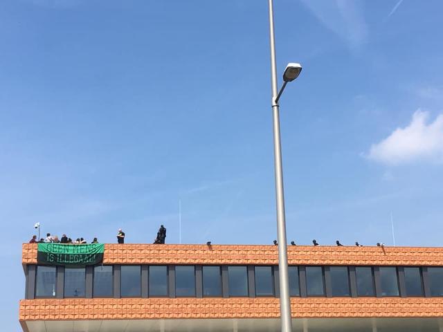 De actievoerders waren op het dak van het complex geklommen. De demonstranten zouden deel uitmaken van No Border, een groep activisten die pleit voor een wereld zonder grenzen, meldt deze organisatie zelf.