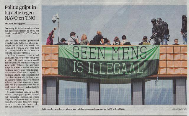Den Haag, 4 augustus 2019 – Vanaf 11 uur voeren ongeveer 80 activisten vanuit het No Border Camp diverse acties op en rond het terrein van TNO en de NAVO Communications and Information Agency in Den Haag (Oude Waalsdorperweg 61-63). De acties zijn een protest tegen de betrokkenheid van de NAVO en TNO bij het militariseren van grenzen en het bijdragen aan redenen waarom mensen moeten vluchten. De activisten proberen het terrein te betreden, gebouwen te beklimmen en spandoeken op te hangen. Vanochtend vroeg zijn vijf mensen opgepakt op of rond het terrein van TNO.